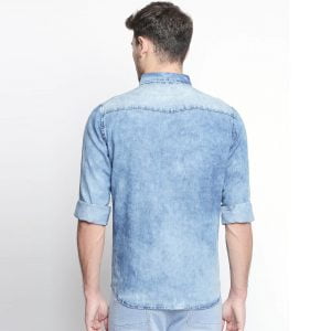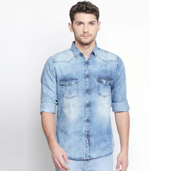 Blue faded casual shirt, has a spread collar, long sleeves, curved hem, two flap pockets